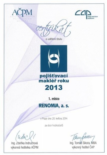RENOMIA ČR oceněna titulem Pojišťovací makléř roku 2013